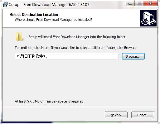 1、在PK下载网将Free Download Manager(fdm下载器)下载下来,并解压到当前文件夹中,点击其中的fdm_x86_setupv6.10.2.3107.exe应用程序,进入安装选择软件安装位置界面,小编建议用户们安装在D盘中,选择好安装位置点击下一步。