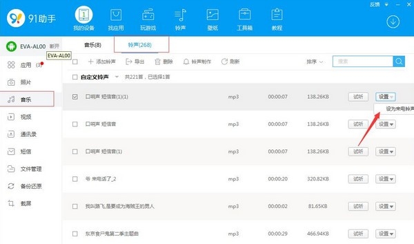 1、接入设备,选择设备中的音乐模块——铃声,选中需要设置的铃声,点击右侧的设置按钮,选择设置为来电铃声。