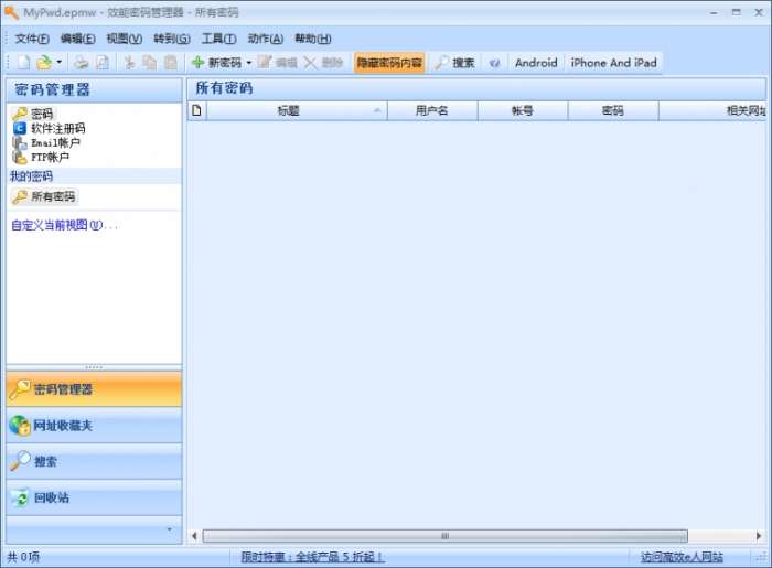 效能密码管理器提供回收站,您不用担心误删除重要信息;备份和恢复功能帮助您方便地保存和迁移数据;软件对密码等敏感信息均加密存储;您可以设置数据文件的打开密码。