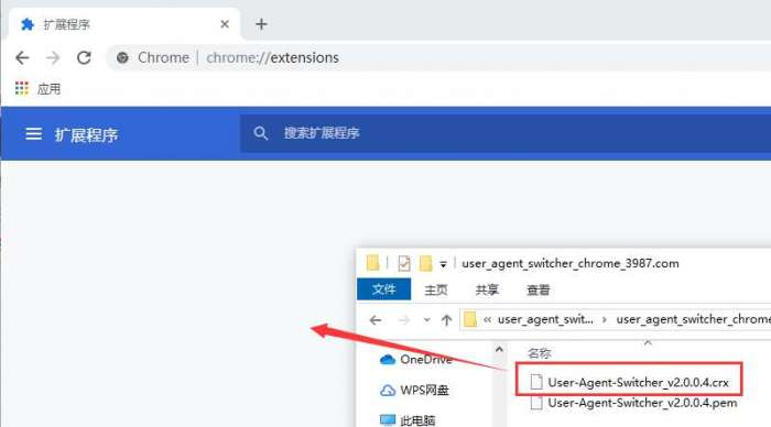 1、下载user agent switcher后,打开谷歌浏览器,先复制chrome://extensions/ 到浏览器地址栏,然后直接将user agent switcher插件拖到浏览器中。