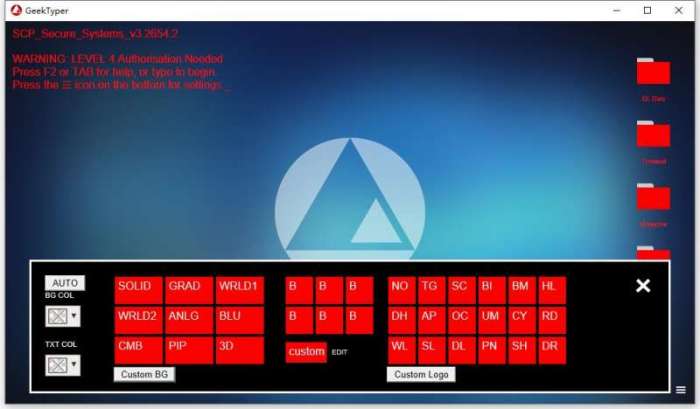 geektyper是一款非常有趣的黑客模拟软件,通过该软件就可以在电脑上模拟黑客操作电脑的过程,炫酷地敲代码以及沉着应对桌面上出现的各种弹窗,非常好玩。用户还能自定义代码颜色、背景以及logo图案。