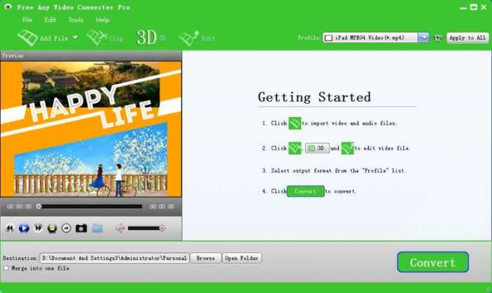 Free Any Video Converter Pro是款功能出众万能的视频格式转换器,可以转换各种常见的视频格式,如MP4、H.264/MP4 AVC、MTS、MXF、MOV、AVI,还支持各类高清蓝光以及3D格式的转换。操作简单,效果极佳,是视频工作者的好助手。