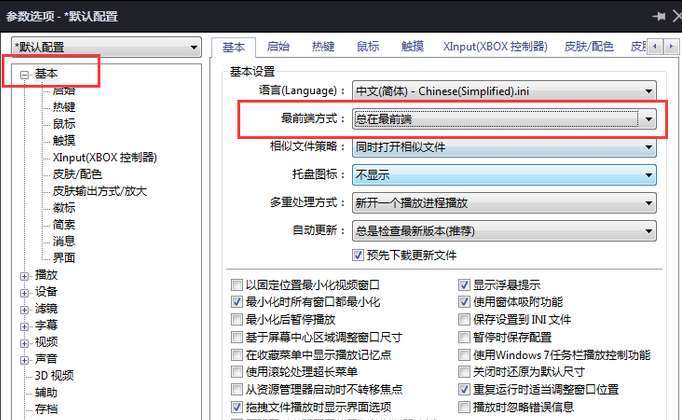 2、之后在选项界面的【基本】中找到【最前端方式】,在这里就可以设置potplayer总是在最前端了。
