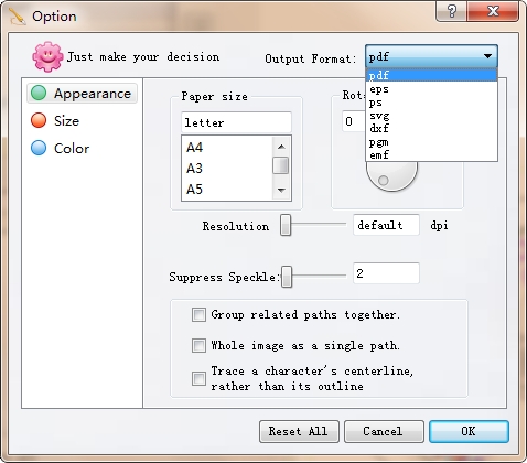 Verypdf光栅到矢量转换器支持不同的线条颜色和填充颜色用于转换的矢量图像。创建的矢量图像的页面大小也可以设置为各种类型。