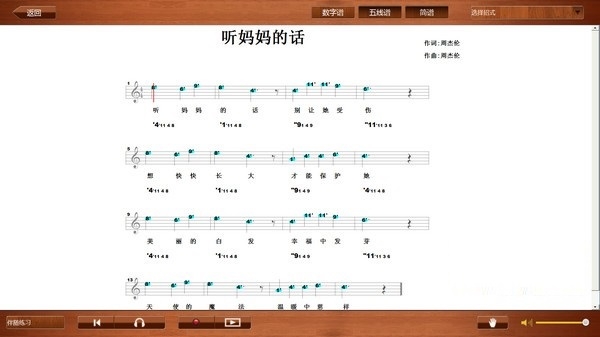 7、在课程中的“练习”环节,你可以从本课程的“推荐曲谱”或是“我的曲谱中选择歌曲进行练习。”