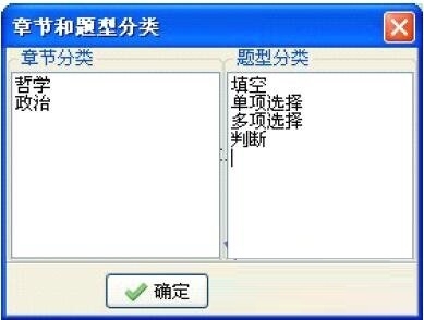 章节和题型都是可编辑的,但选择题不管是“单项选择”还是“多项选择”,题型内容都必须含有“选择”两字,这是保证系统正确判分的重要识别标志,不能简称为“单选”、“多选”。同理,判断题必须有“判断”两字。题型分类中的顺序就是题库操作时各题型的排序,如习惯填空题在先,定义时应将其放在前排。