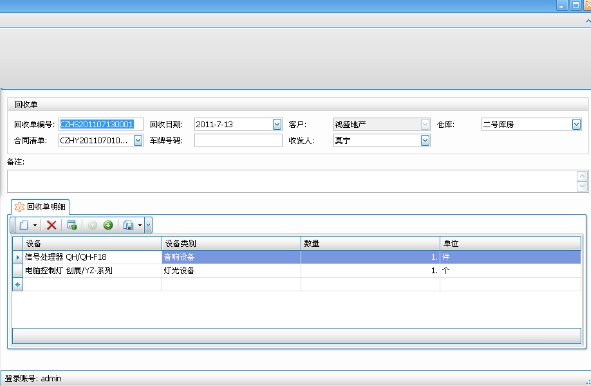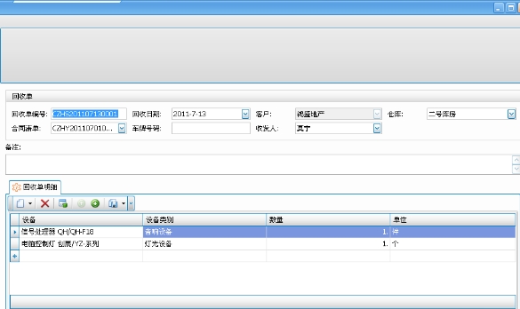 舞台租赁软件出租管理-出租回收单的具体属性包括:编号、回收日期、合同清单、客户、仓库、车牌号码、收发人、备注、回收单明细等属性。