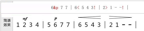 渐强渐弱符号,则使用“<”或“>”表示起点,终点直接使用“!”作为结束记号。
