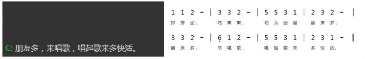 简谱主体仅包含词和曲两种内容,每行内容对应简谱中的每一行,行开头以Q或C定义内容类型,Q表示曲,C表示词。如下图: