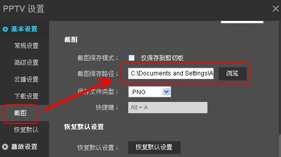 7、PPTV截图保存路径的修改:我们也可以修改截图保存的路径,方便我们以后查看,这里就不再演示了。关于其他设置的修改,相信大家到此已经会了,这就不再重复了