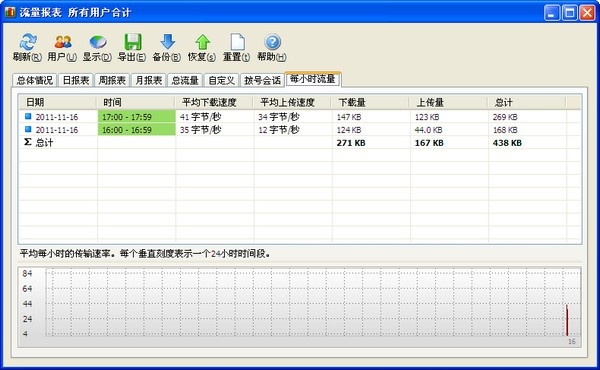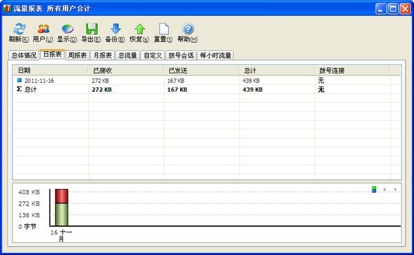 收入和发出的网络流量以折线图形式表示并记录到一个文件中, 因而用户可以随时查看每天、每周和每月关于带宽使用和拨号上网时间的统计信息。统计报表可导出为多种不同的格式,例如 HTML、MS Word 和 Excel,提供进一步的分析。