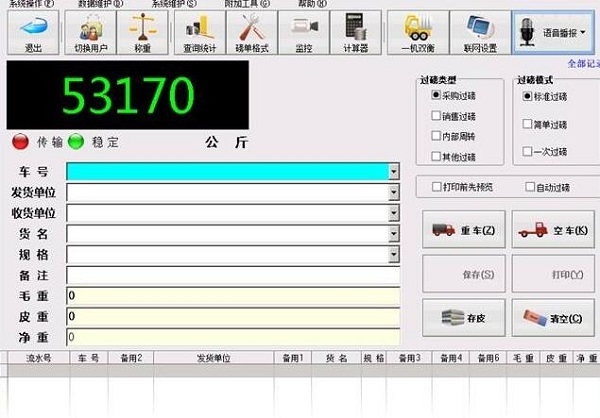 3.自动调用记录:数据量比较多,没有选择一条记录时,直接输入“车号”,点“毛/皮重”自动调出此车上次的计量信息,并计算出净重重量。