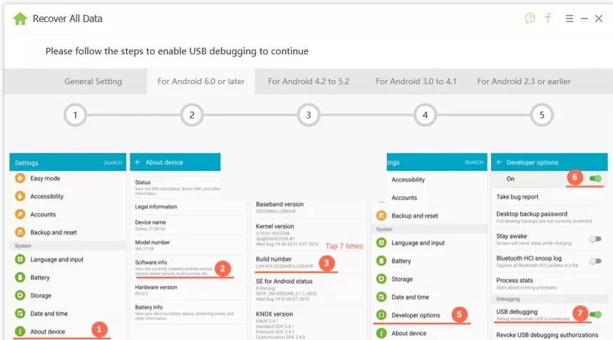 对于Android 6.0或更高版本:“设置”>“关于手机”>“软件信息”>快速连续点击7次“内部版本号”>返回>“开发选项”>打开“开发人员选项”>“ USB调试”。