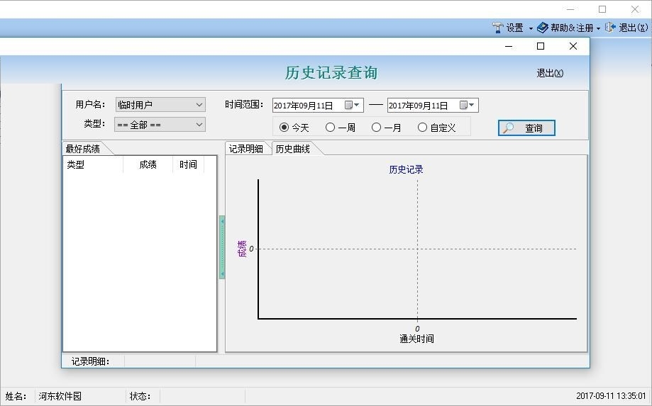 7、历史记录查询包括了用户名、类型、时间范围、今天、最好的成绩、记录明细、历史曲线等;