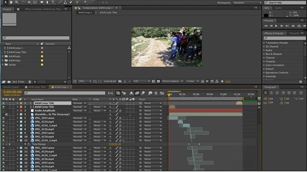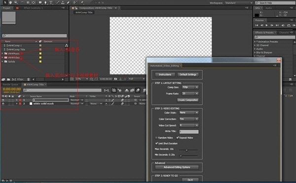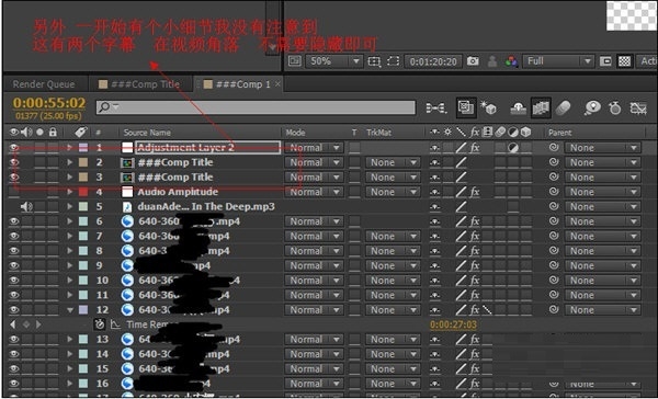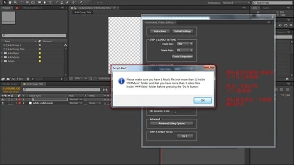 4、生成之后在左侧可以找到这个comp,将我们提前准备好的一些素材直接拖拽进去!注意视频放入###video,音频放入###music、一般最少都要有4个视频和一个音频!