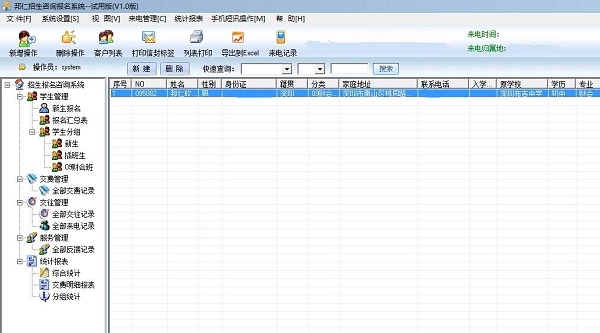 邦仁招生报名管理系统最新版是一款学校招生咨询报名管理系统软件。邦仁招生报名管理系统最新版包含了新生报名、报名汇总表、新生信息、插班生信息、缴费管理、缴费记录、全部交往记录、全部来电记录、全部反馈记录、综合记录、缴费明细报表等主要功能。邦仁招生报名管理系统可以随时备份系统中的数据。
