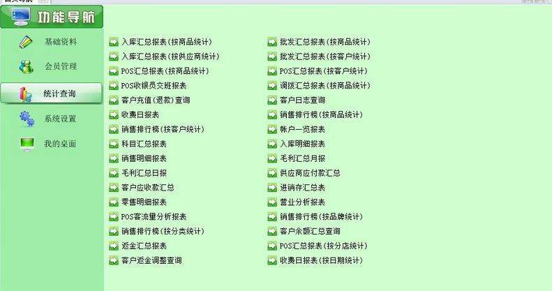 5、统计查询包括了入库汇总报表、POS汇总报表、客户充值、科目汇总报表、客户反金调整查询等;