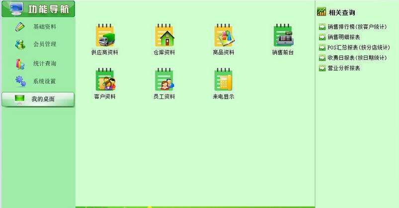 3、进入首页导航的界面,我的桌面包括了供应商资料、仓库资料、商品资料、销售前台、客户资料、员工资料、来电显示;