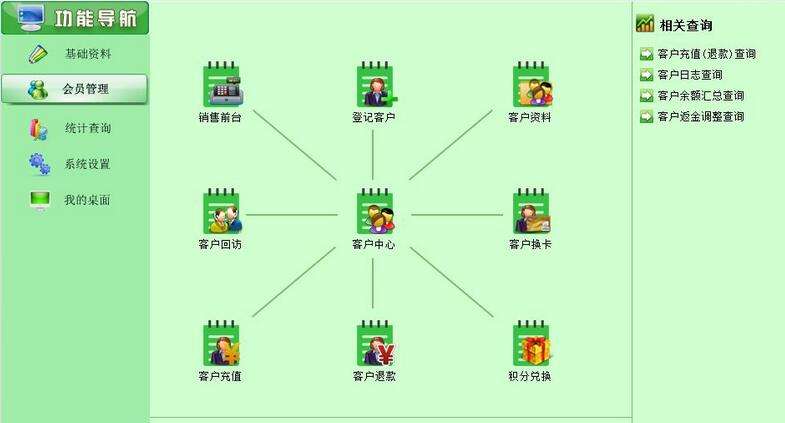 4、会员管理包括了客户中心、登记客户、客户资料、客户换卡、积分兑换、积分调整等;