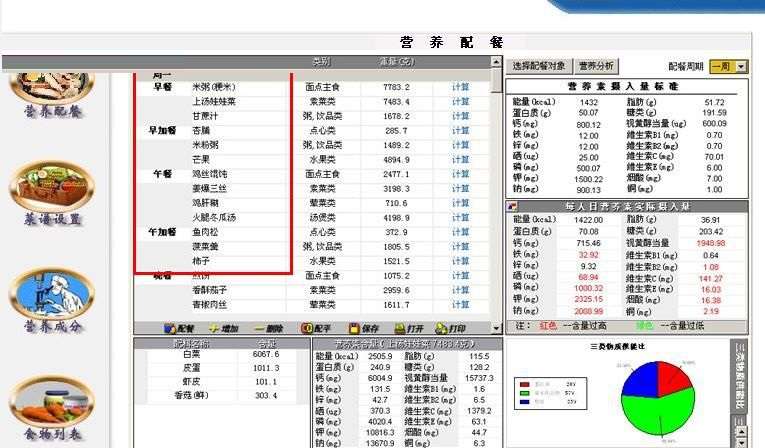 食谱的制定不但可以以周为单位,也可以为特定的一天制定食谱。而所有这些食谱都可以输出打印,打印内容全面丰富,不仅包括一周或一天的食谱,还包括食谱所能提供的18种营养素的确切含量以及各种菜谱的贡献比例。打印版面可大可小,方便收藏管理或张贴公示之用。