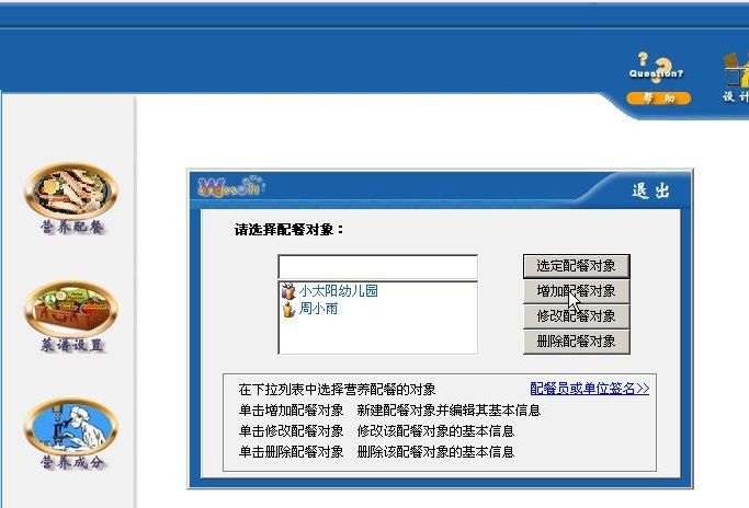 1、点击启动智能营养配餐系统,这里提示软件的配置界面,可以选择为对象设置菜谱,例如您可以选择幼儿园食谱制作