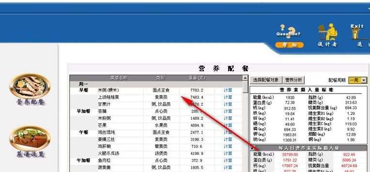 6、您可以在软件的右上角选择配置一个月或者是一周的菜单,这里显示一天的菜单,包括早餐、午餐