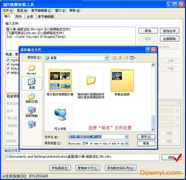需要操作的是把三个文件添加进来,然后到最后面的“输出文件名”上设置保存文件路径,点击“浏览”按钮,在弹出的窗口上选择位置,有“桌面”、“我的文档”、“我的电脑”等,可以选择容易找到保存的位置。