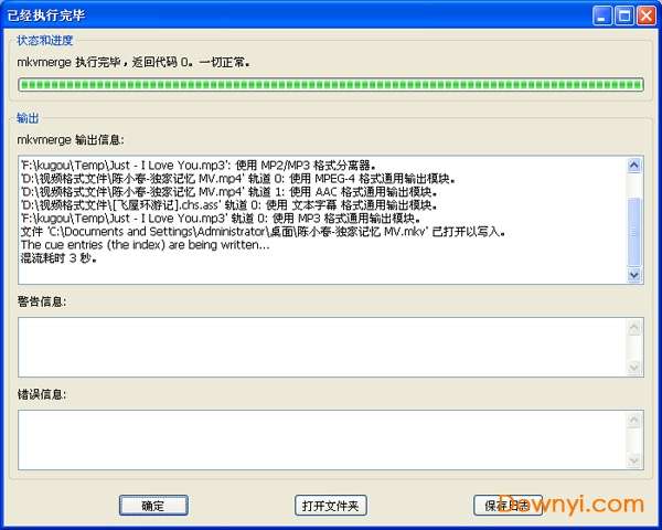 最后点击“开始混流”按钮,软件开始把视频、音频、字幕文件合并在一起,等到提示“已经执行完毕”之后,就可以到保存的位置上运行预览合并后的视频文件。