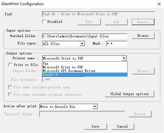 提供了两个silentprint组件——一个客户机应用程序和一个服务。客户端提供了配置接口,而服务则监控监视文件夹以查看支持的文档。识别后,服务批处理并对文档进行排序,然后将它们输出到与监视文件夹相关联的打印机驱动程序。