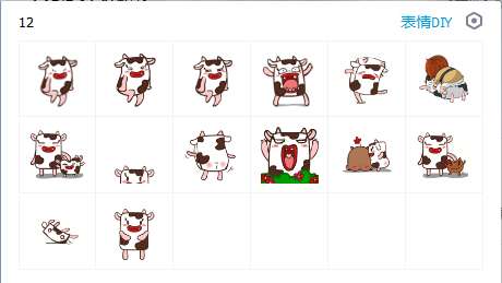 一只圆角距形奶牛,表情有:撒花,踢腿,跳舞,拍头,张大嘴,跳,在地上晃,拍小牛,help,抖腿,寒,打屁股。