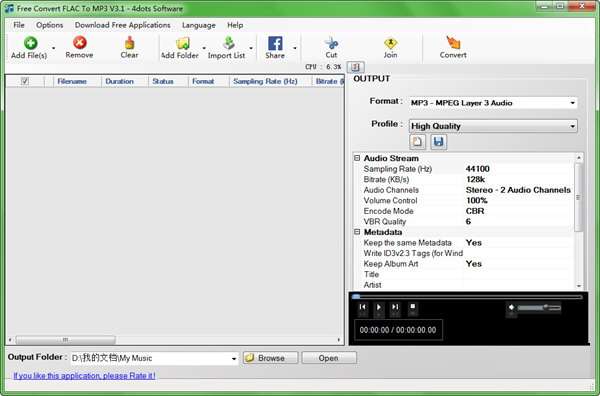 Free Convert FLAC To MP3是一款方便易用的flac转换mp3软件。该软件可以快速把FLAC音频转换为MP3等音频格式,只需要把源文件加入,设置输出文件的格式和码率,点击转换按钮就可以轻松搞定啦。