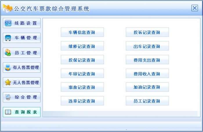 5、查询报表:车辆信息查询,维修记录查询,投保记录查询,年审记录查询,事故记录查询,违章记录查询,投诉记录查询,出车记录查询,费用支出查询,费用收入查询,加油记录查询,员工记录查询。