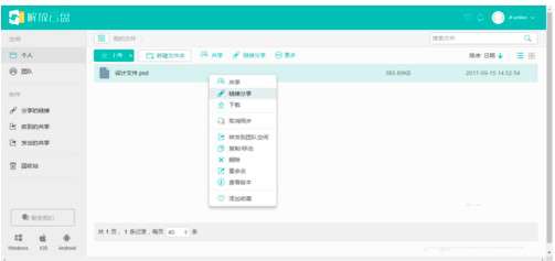 2、右击文件,选择共享或链接分享。共享可以与同企业内的云盘用户快速分享该文件;链接分享可以为文件生成链接,并配置权限,与任何人分享。将设计文件发送给客户或印刷厂时,可以选择链接分享。