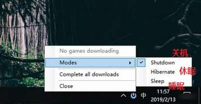 SteamShutdown 会自动检测到 Steam 进程,并识别下载任务,你可以选择一个、多个或全部下载任务,然后设置为关机、休眠、睡眠。