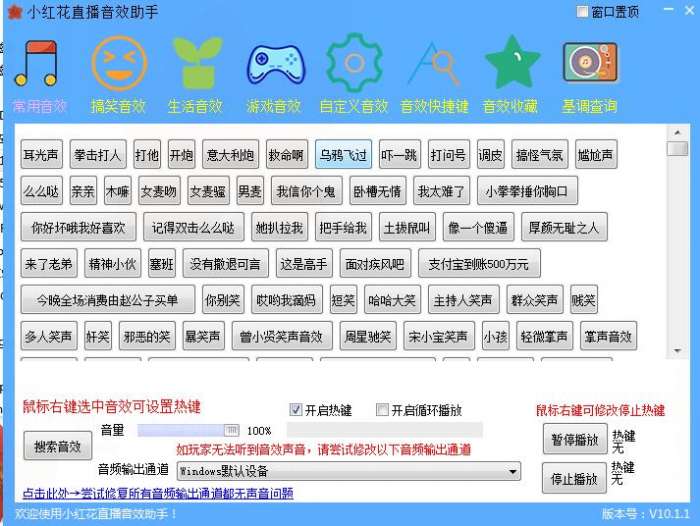 小红花音效助手官方版是一款操作简单、功能全面的音频处理软件,小红花音效助手官方版可以帮助用户轻松制作各种有趣的音效, 是各大平台主播活跃气氛的必备软件助手,内置上千款常用音效,小红花音效助手官方版汇集了常用、搞笑、生活以及游戏四大类音效,支持热键设置也可以自定义设置音效。