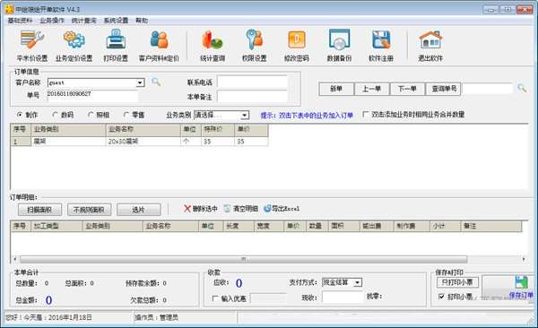 中绘喷绘开单软件最新版是一款功能强大的喷绘办公软件,中绘喷绘开单软件电脑版支持统计查询、平米价设置、业务定价设置等功能,支持自动识别图片尺寸、张数,中绘喷绘开单软件最新版可以根据不同的材料计算出需要的面积和金额等。
