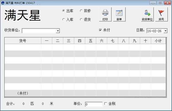 满天星布料打单最新版是一款界面简洁且专业的布料打单软件,满天星布料打单官方版是一款专门用来为布料行业开票打单的软件,它能够更加精细不易出错的开具单据票据,让工作可以更加方便,满天星布料打单最新版只输入数字即可,匹、米(或公斤)自动统计。