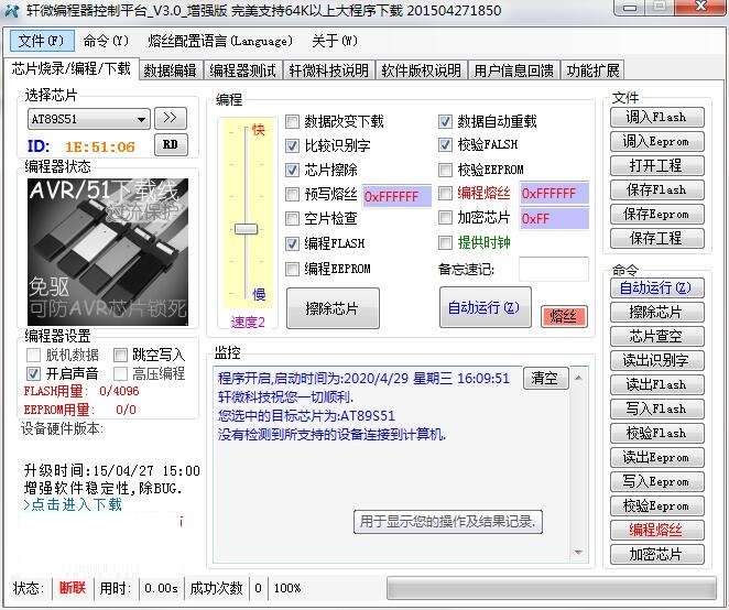 1、程序开启,启动时间为:2018-10-30 8:54:42轩微科技祝您一切顺利.您选中的目标芯片为:AT89S51,没有检测到所支持的设备连接到计算机.