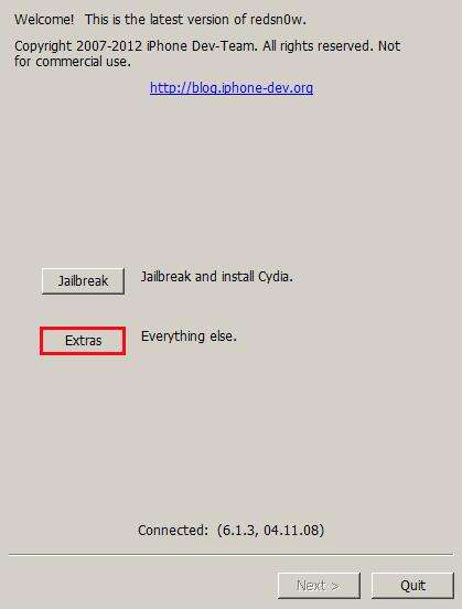 1、解压后打开Redsn0w,选择“Extras(其它)”;