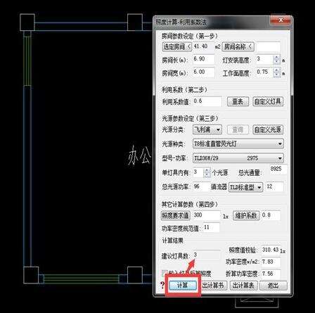 5、再接着还是返回在照度计算弹框中选择利用系数值,光源种类及型号等等参数,这个根据自己的需求来设定即可。