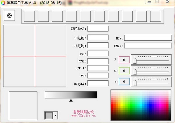 5.支持rgb颜色和hsv颜色双显示,支持10进制和16进制双选项。hsv颜色模型显示的色调、饱和度和亮度的取值与windows上的画图程序的取值完全一致。、