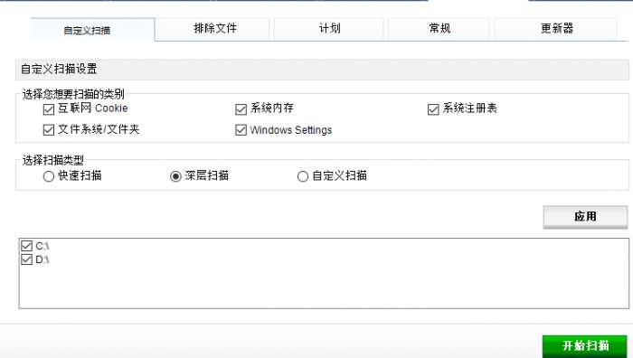 自定义扫描功能,在软件界面选择你需要扫描的内容,取消就不会扫描