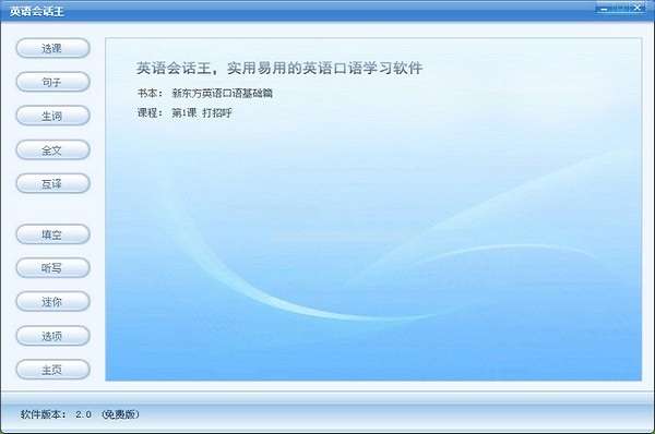 英语会话王是一款专业学习英语口语的英语学习软件,英语会话王支持选课、句子、生词、全文、互译、填空、听写等学习功能,在学习英语理论知识的基础上加深英语基础,提升英语表达能力。