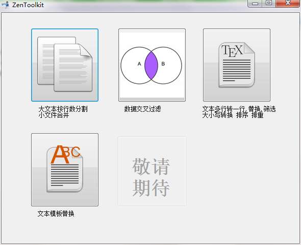 zentoolkit官方版是一款实用的文本工具箱。zentoolkit最新版同时提供文本文件拆分,合并,数据排重,合并,集合运算,文本替换,排序,模板替换等功能。zentoolkit官方版文本模板替换,不同平台提交数据格式不一样,小伙伴只需要做好excel 就可以用模板生成数据,并且软件的功能都显示在主界面。