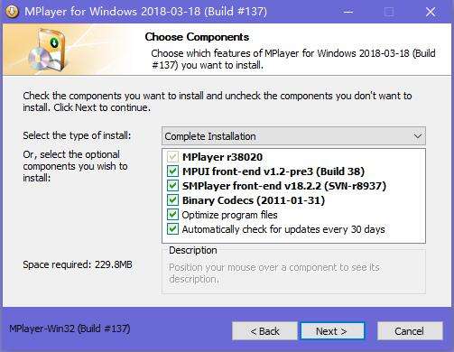 4、设置完MPlayer播放器安装目录后,进入到MPlayer播放器安装组件选择界面,请根据自己需求选择