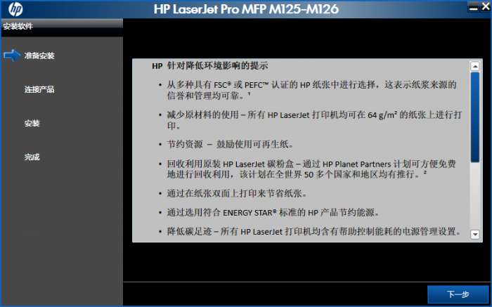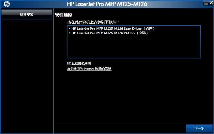 3.双击打开,进入HP惠普LaserJet Pro MFP M125/126多功能一体机PCLm驱动软件界面,点击下一步