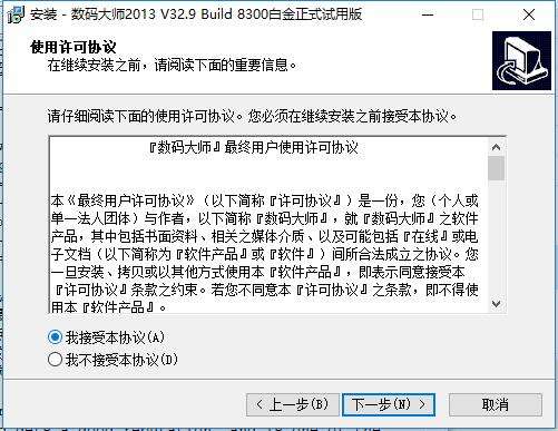 3、进入数码大师安装协议界面,您可以先阅读协议中的内容,阅读完成后点击“我接受本协议”,然后点击“下一步”。