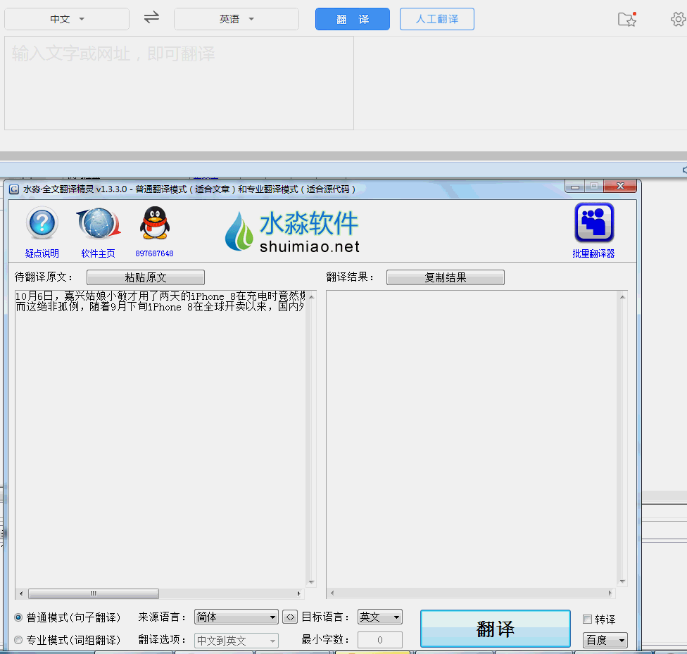 水淼软件出品的一款批量翻译(单向)和转译(双向)文章的软件。