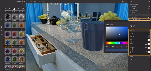 要优化容器的外观,请在“场景”面板中展开GelatoPint。选择蓝色塑料。您可以在“场景”面板下方的“属性”面板中更改材质属性,例如“基础颜色”,“发光度”和“粗糙度”。