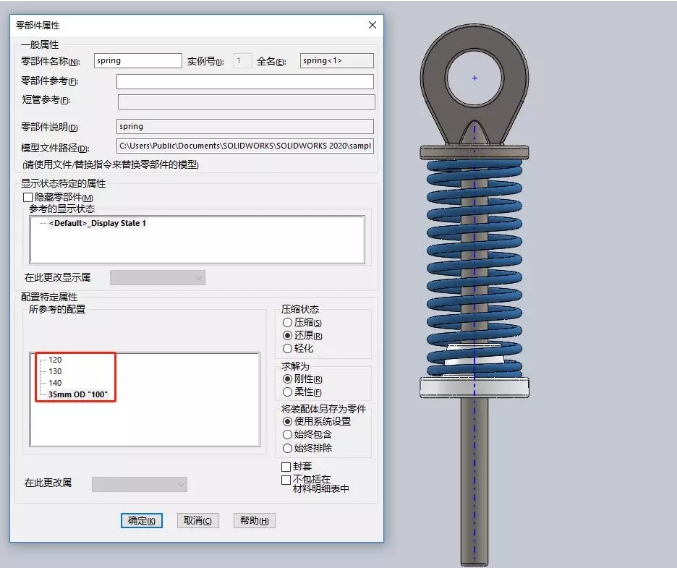 在之前的SOLIDWORKS版本中,我们需要把弹簧预先做多个配置,然后装配体环境中切换弹簧配置,选中弹簧-右键属性-选中相应配置,改变弹簧状态。